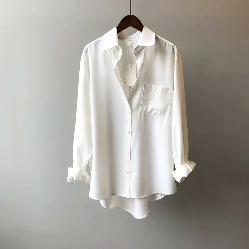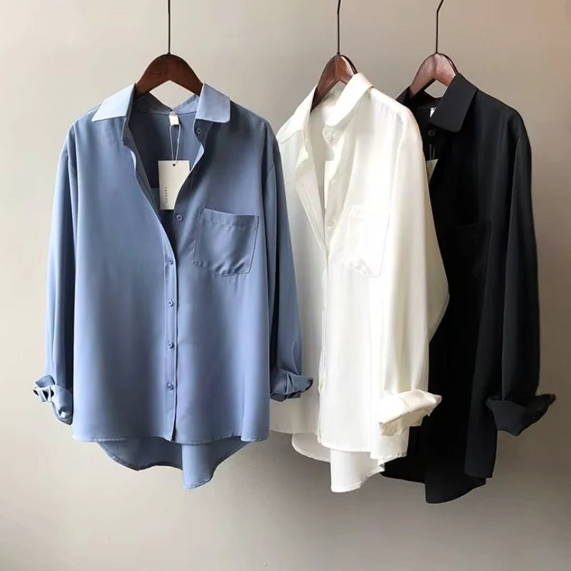 Verleihen Sie Ihrer Garderobe einen Hauch von Eleganz mit dieser stilvollen Charmeuse-Bluse – eine vielseitige Ergänzung für jede Gelegenheit.