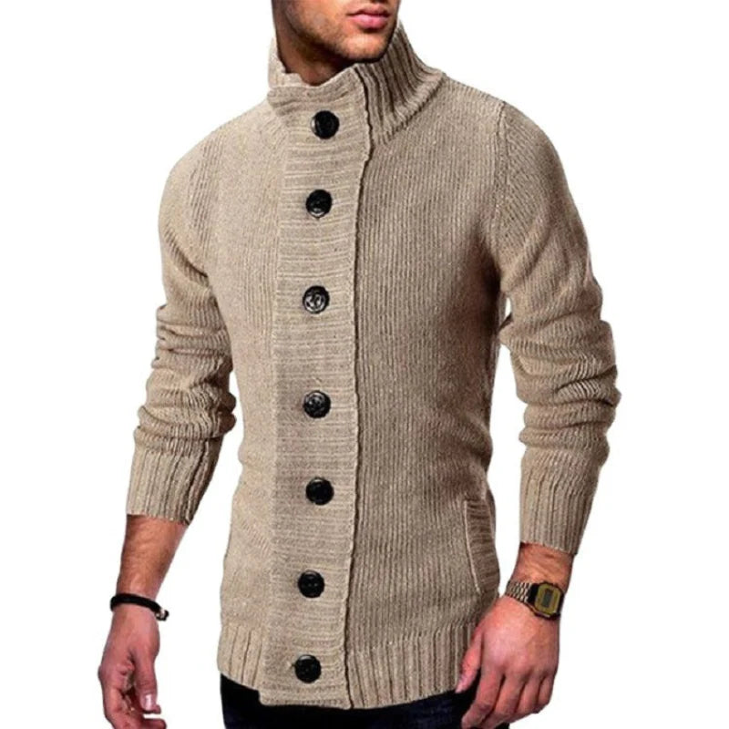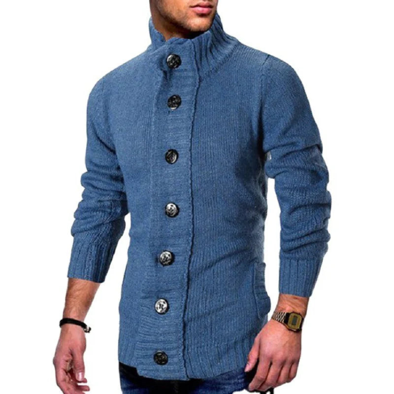 Diese Herren-Strickjacke vereint klassisches Design mit modernem Komfort. Das weiche Strickmaterial sorgt für ein angenehmes Tragegefühl, während die markante Knopfleiste und der hohe Kragen dem Look eine stilvolle Struktur verleihen.