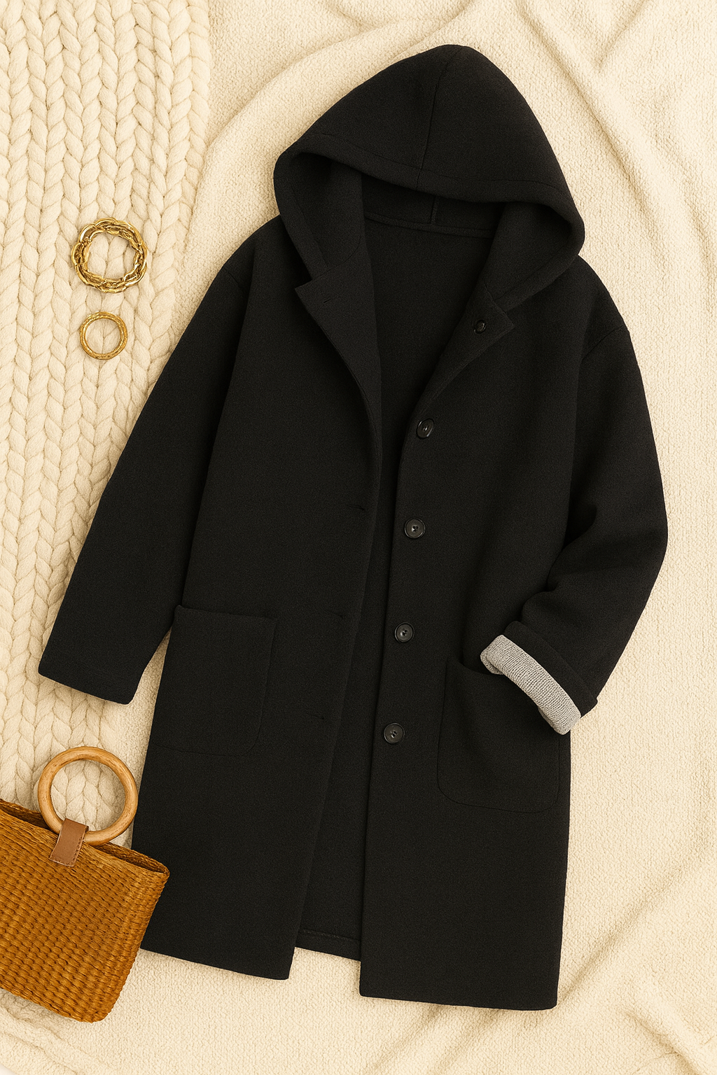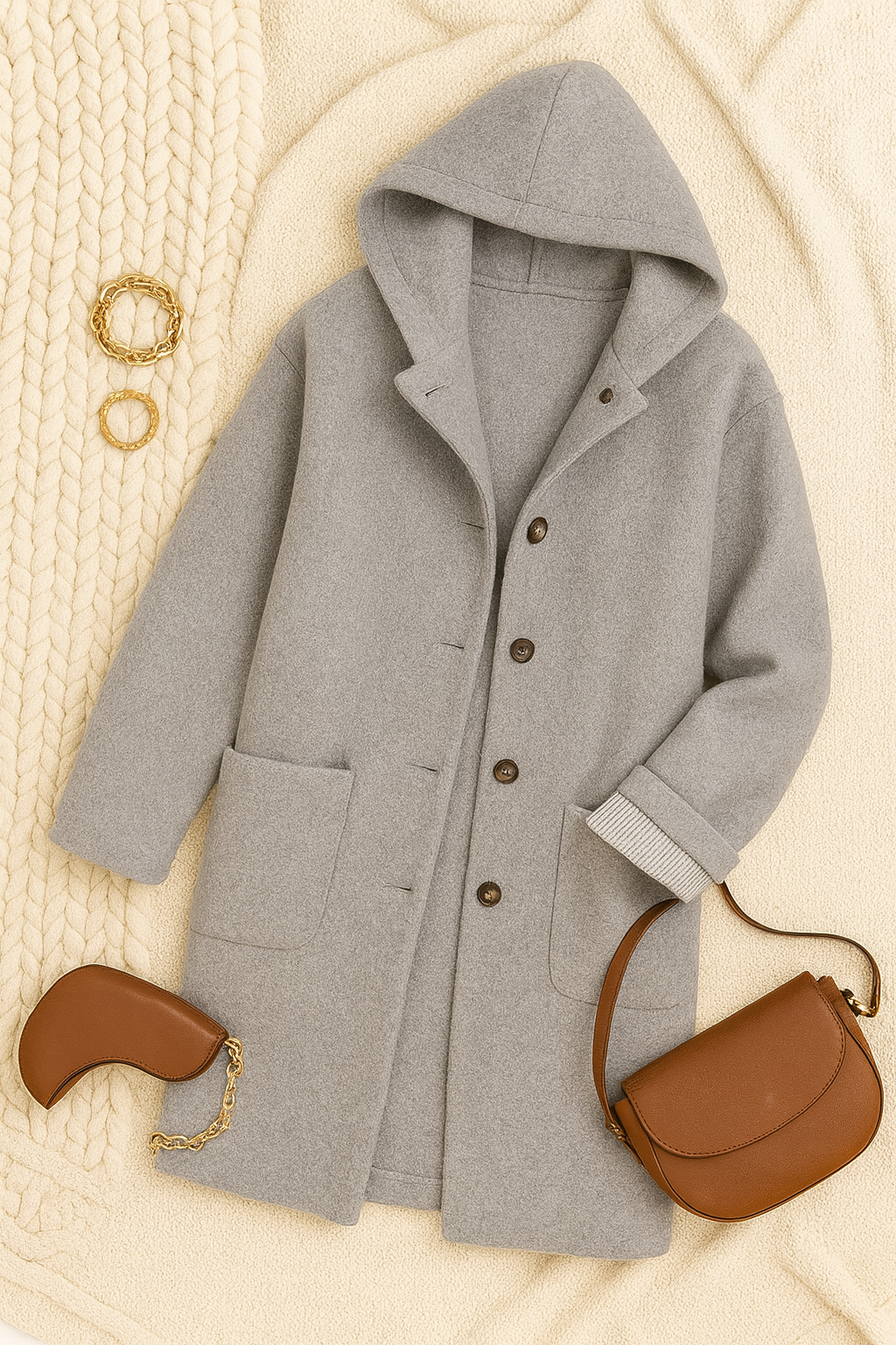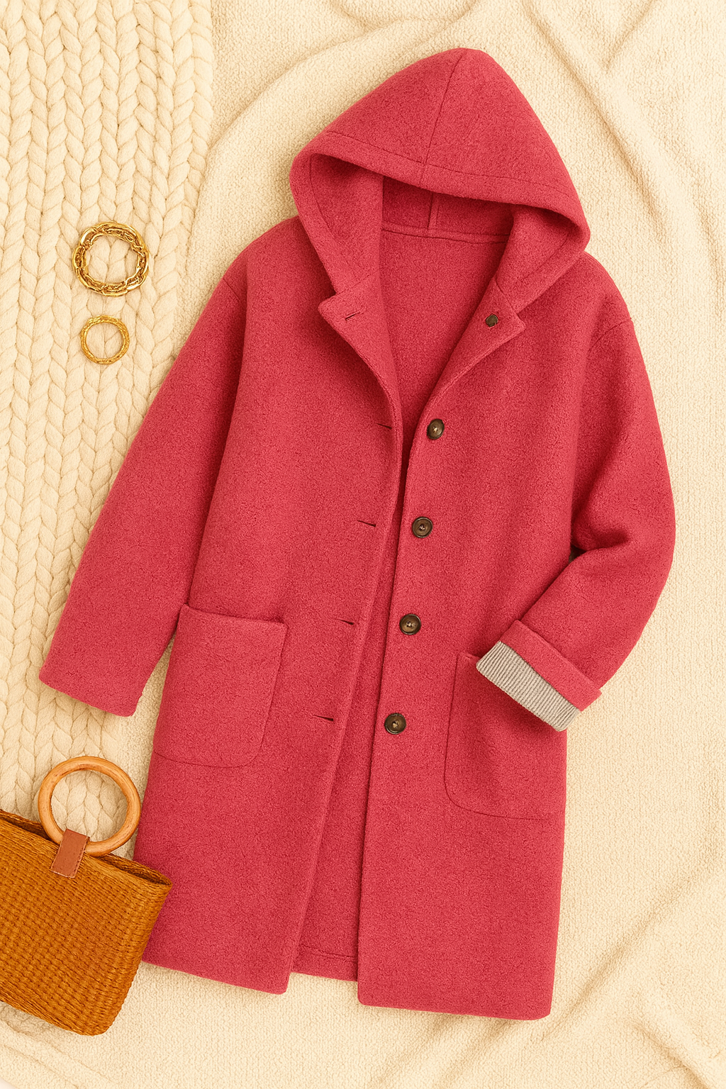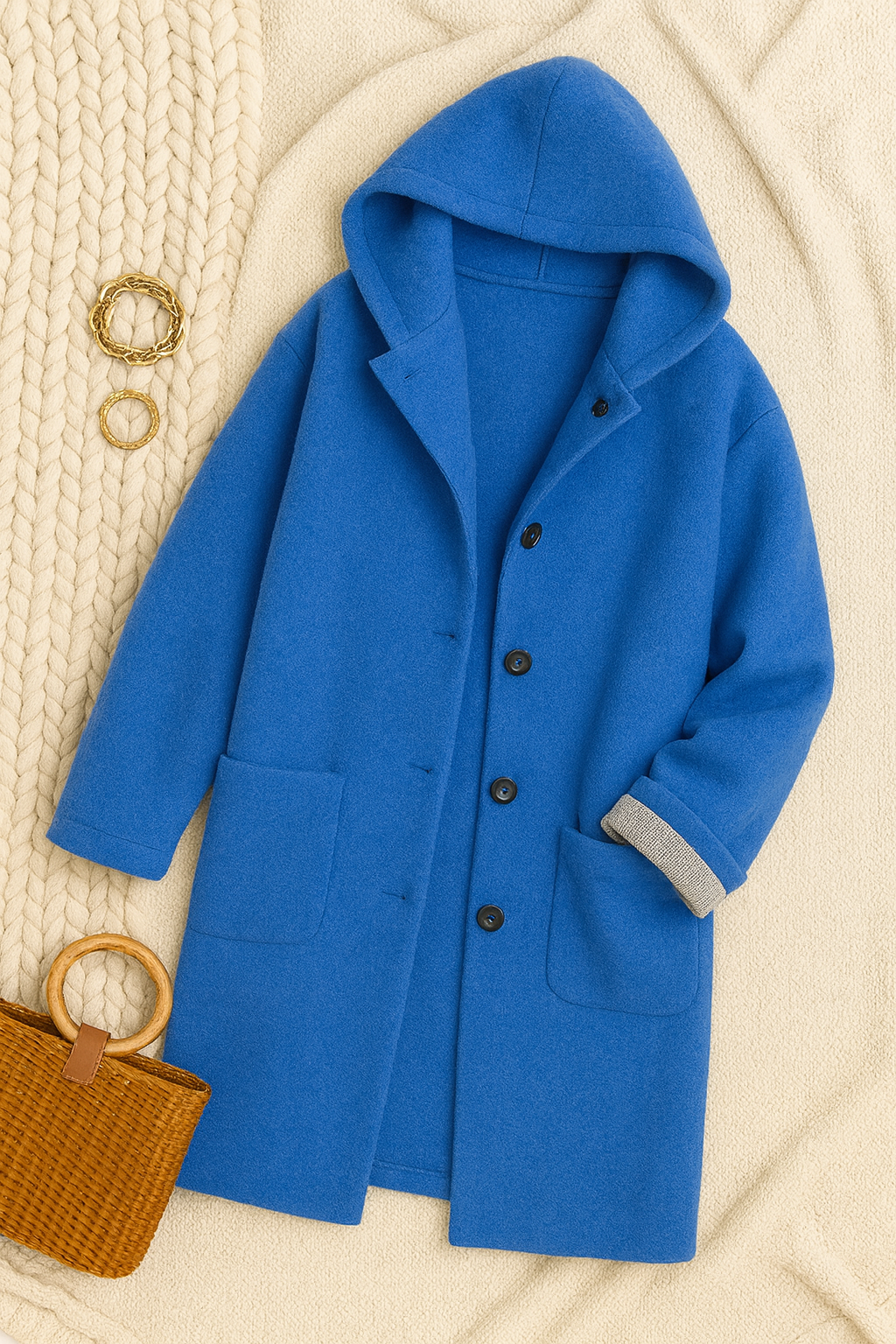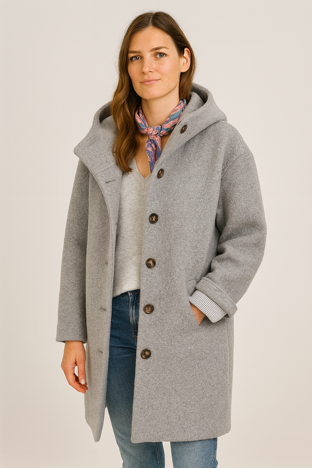 Dieser Damenmantel aus hochwertigem Wollgemisch vereint stilvolle Eleganz mit praktischer Funktionalität. Die entspannte Passform sorgt für optimalen Tragekomfort, während die Kapuze zusätzlichen Schutz vor Kälte bietet. Ideal für die Übergangszeit oder kühle Abende, ist dieser Mantel ein vielseitiges Kleidungsstück für jede Garderobe.