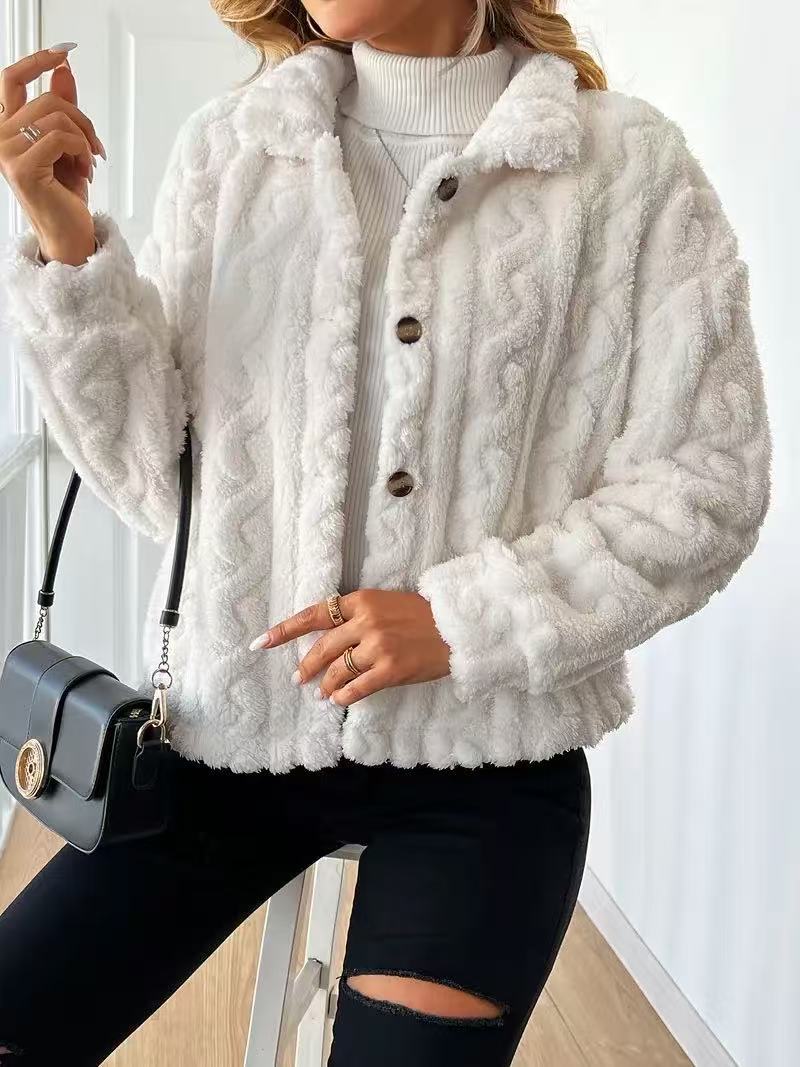 Füge deiner Garderobe diese gestreifte Plüschjacke mit Knopfverschluss hinzu – für eine weiche und praktische Lage in der kühlen Saison.
