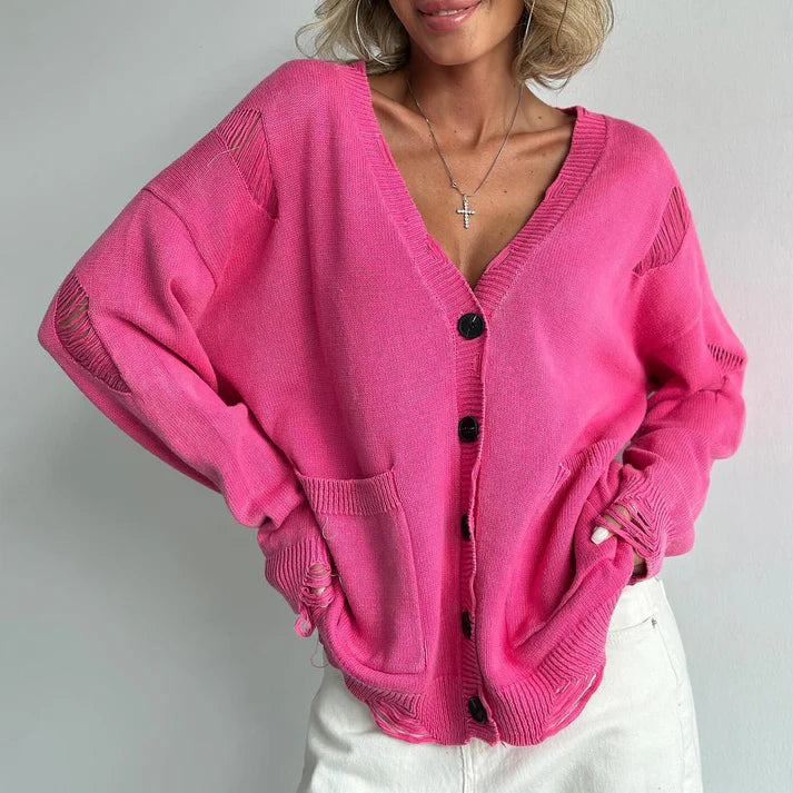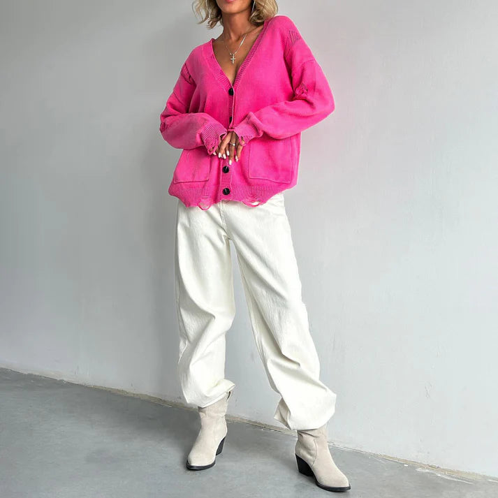 Erweitere deine Garderobe mit einer V-Ausschnitt-Strickjacke aus Poly-Baumwollmix, die Vielseitigkeit und Schlichtheit vereint.