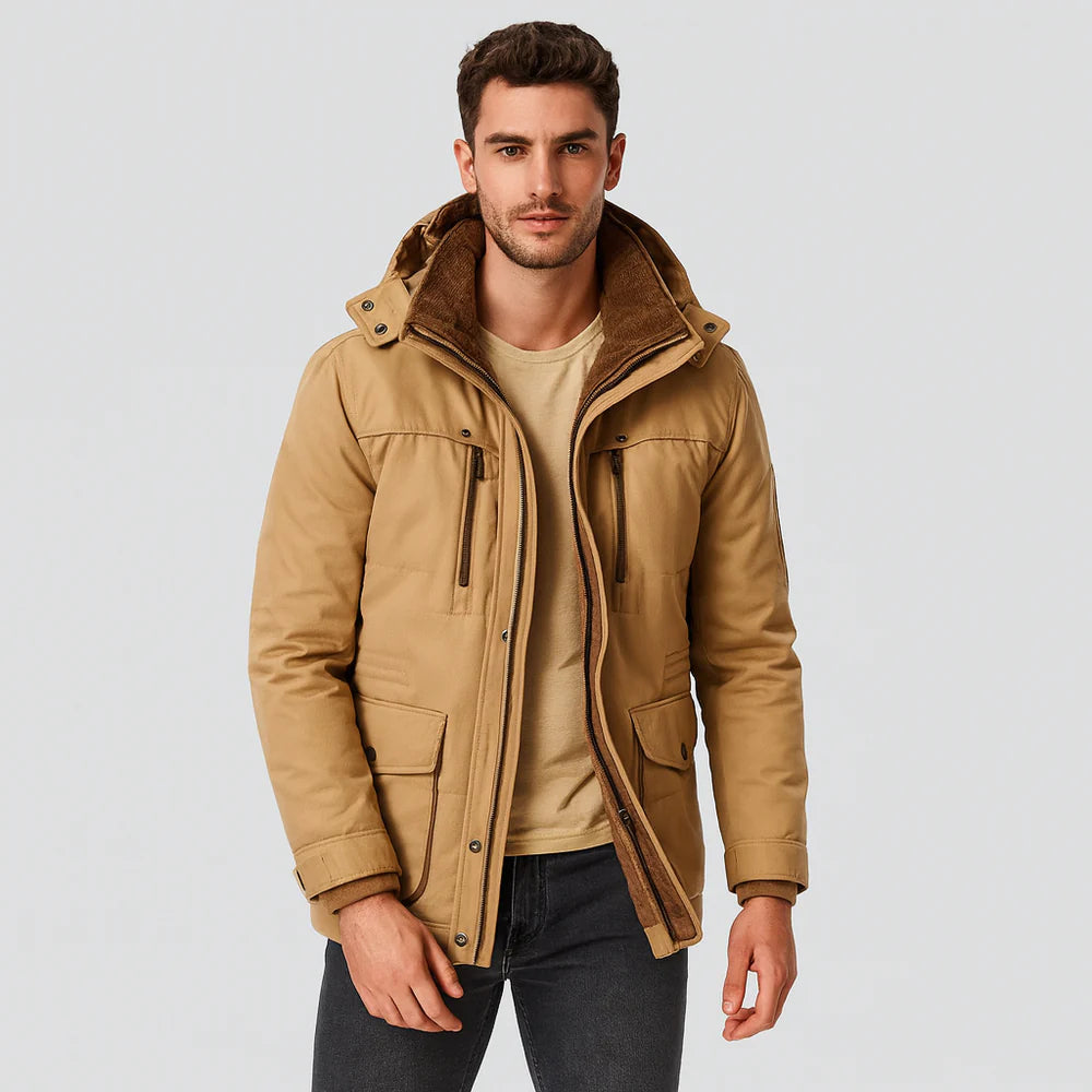 Diese Herrenjacke mit Kapuze kombiniert wärmenden Komfort mit einem klaren, urbanen Design. Das weiche Innenfutter schützt zuverlässig vor Kälte, während der wasserabweisende Außenstoff und die verstellbare Kapuze optimalen Schutz bei Wind und Wetter bieten.