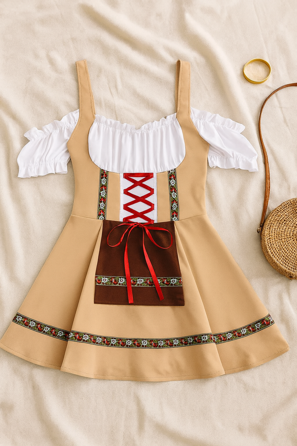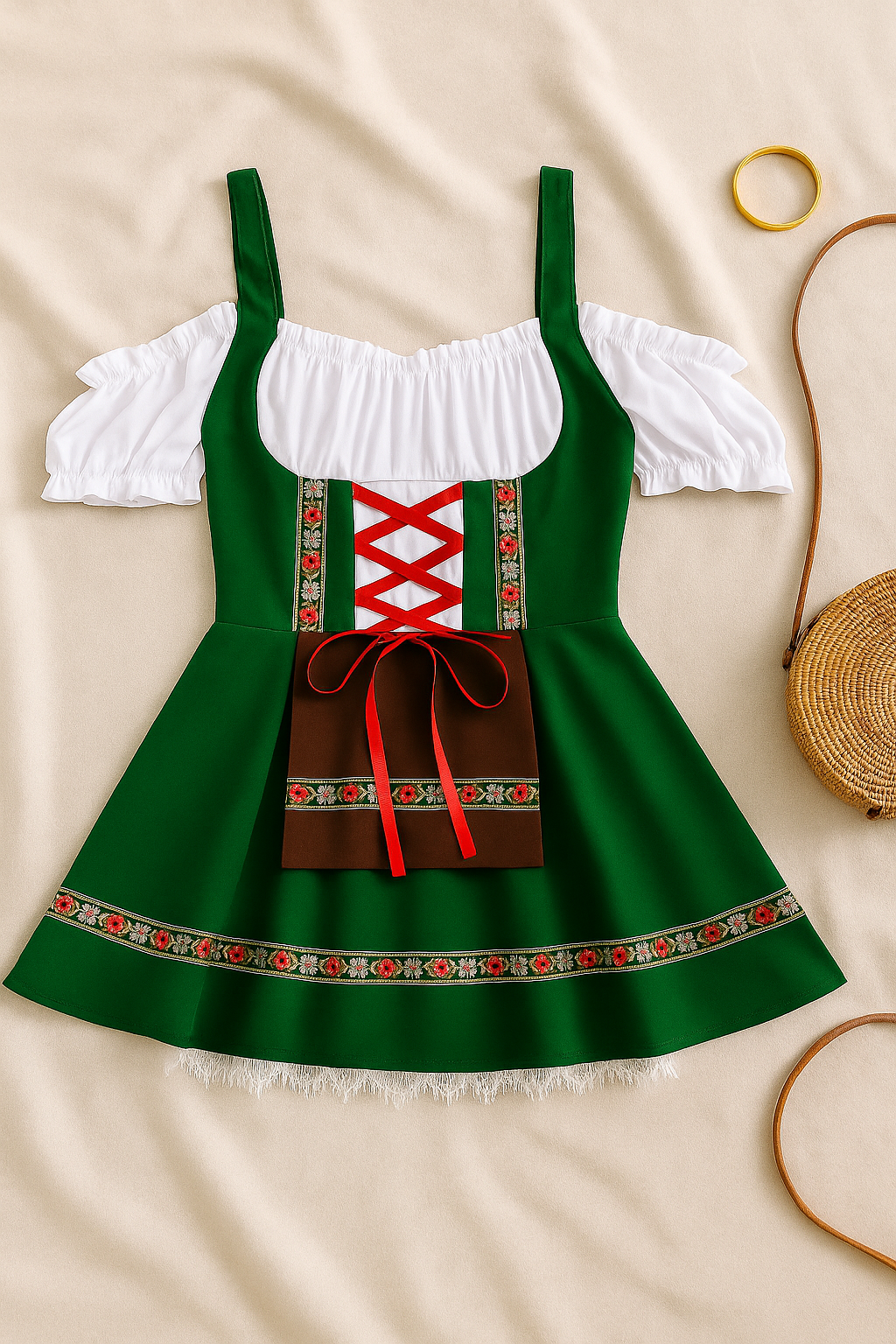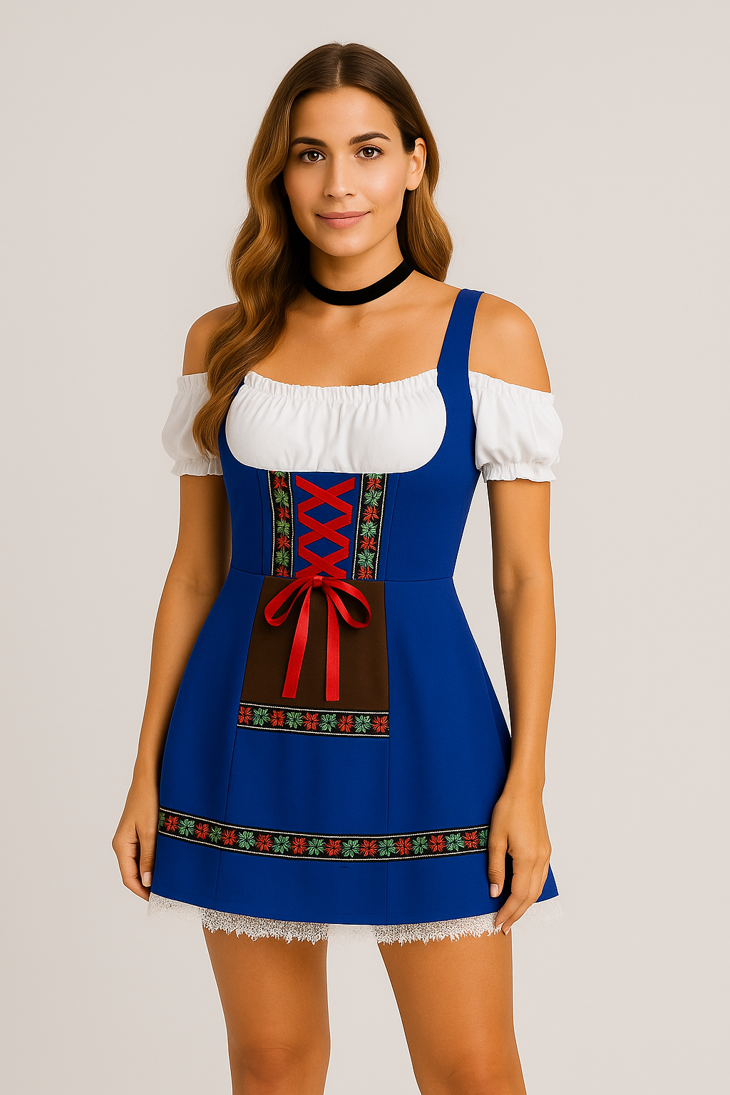 Dieses Damenkostüm vereint den Charme eines Oktoberfest-Looks mit dem verspielten Charakter eines Cosplay-Outfits. Mit seinem figurbetonten Oberteil, dem klassischen V-Ausschnitt und dem ausgestellten Rock sorgt es für einen auffälligen Auftritt – egal ob auf der Bühne, zu Halloween oder bei besonderen Motto-Events.