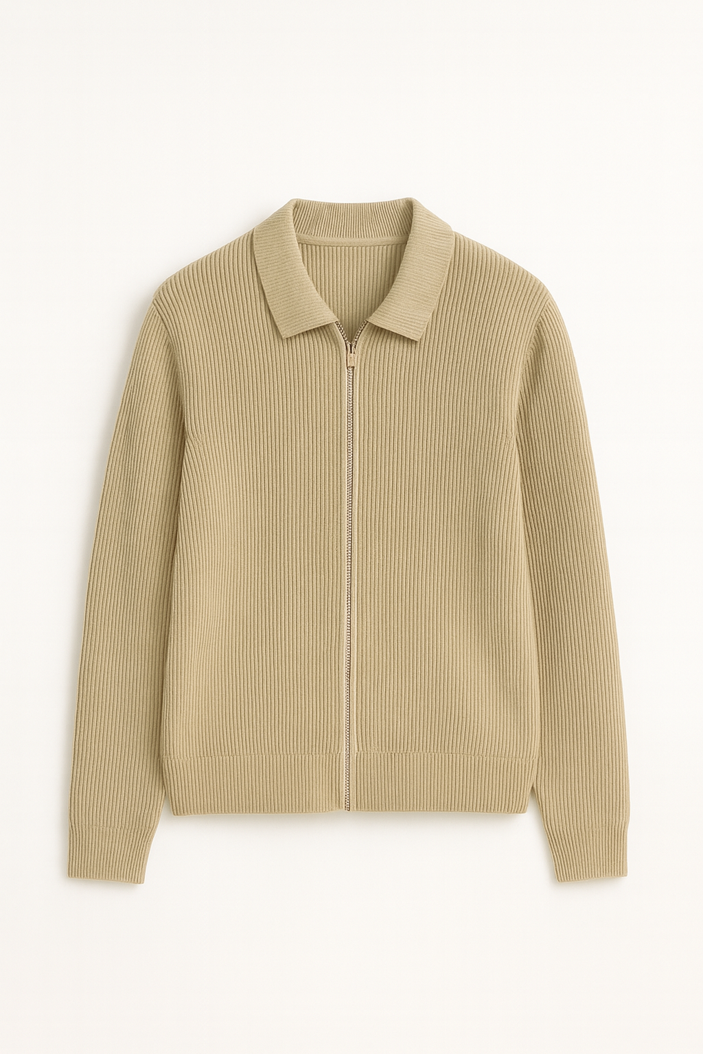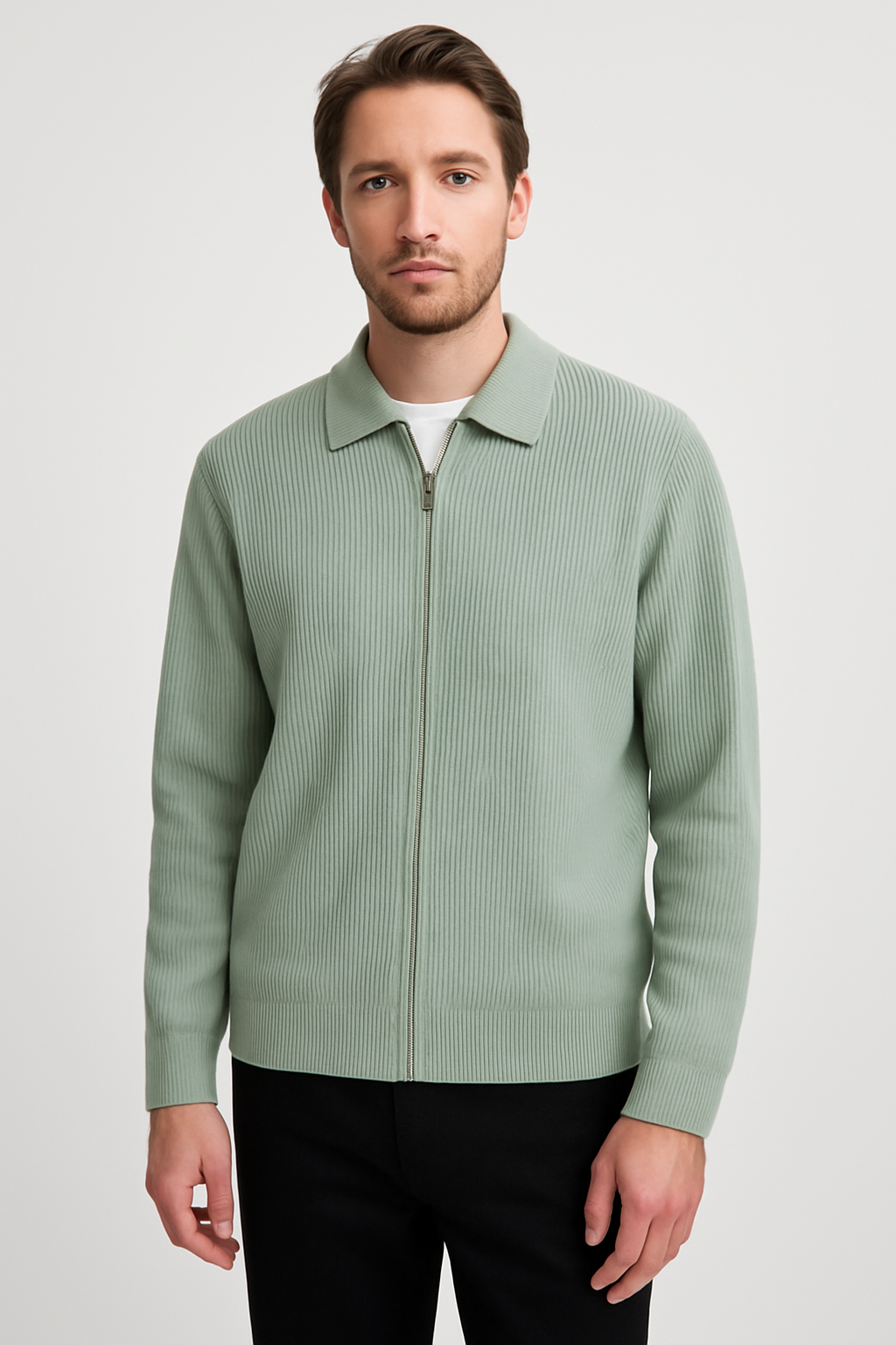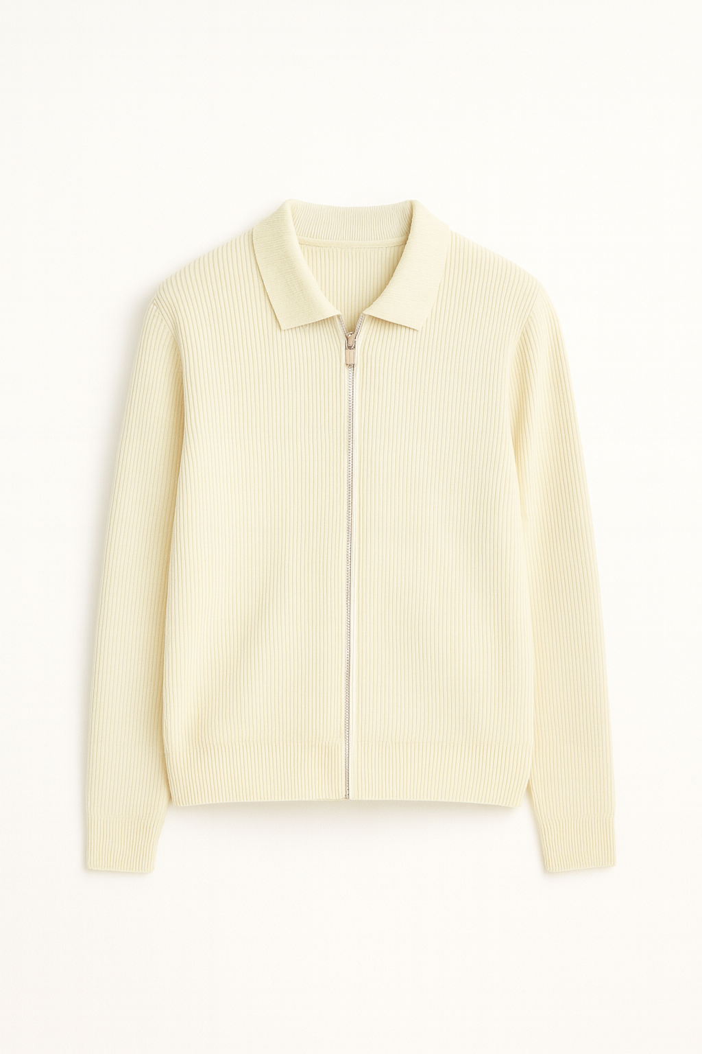 Diese Herrenjacke in Bomber-Stil vereint minimalistisches Design mit gehobenem Tragekomfort. Gefertigt aus hochwertigem Feinstrick, schmiegt sie sich weich an den Körper und bietet durch den elastischen Bund sowie die dezenten Rippabschlüsse an Ärmeln und Saum eine perfekte Passform. Der durchgehende Reißverschluss und der klassische Kragen verleihen ihr einen zeitlosen Look – ideal für den Alltag, das Büro oder stilvolle Wochenend-Outfits. Die klare, cremefarbene Optik sorgt für einen eleganten Auftritt bei jedem Anlass.